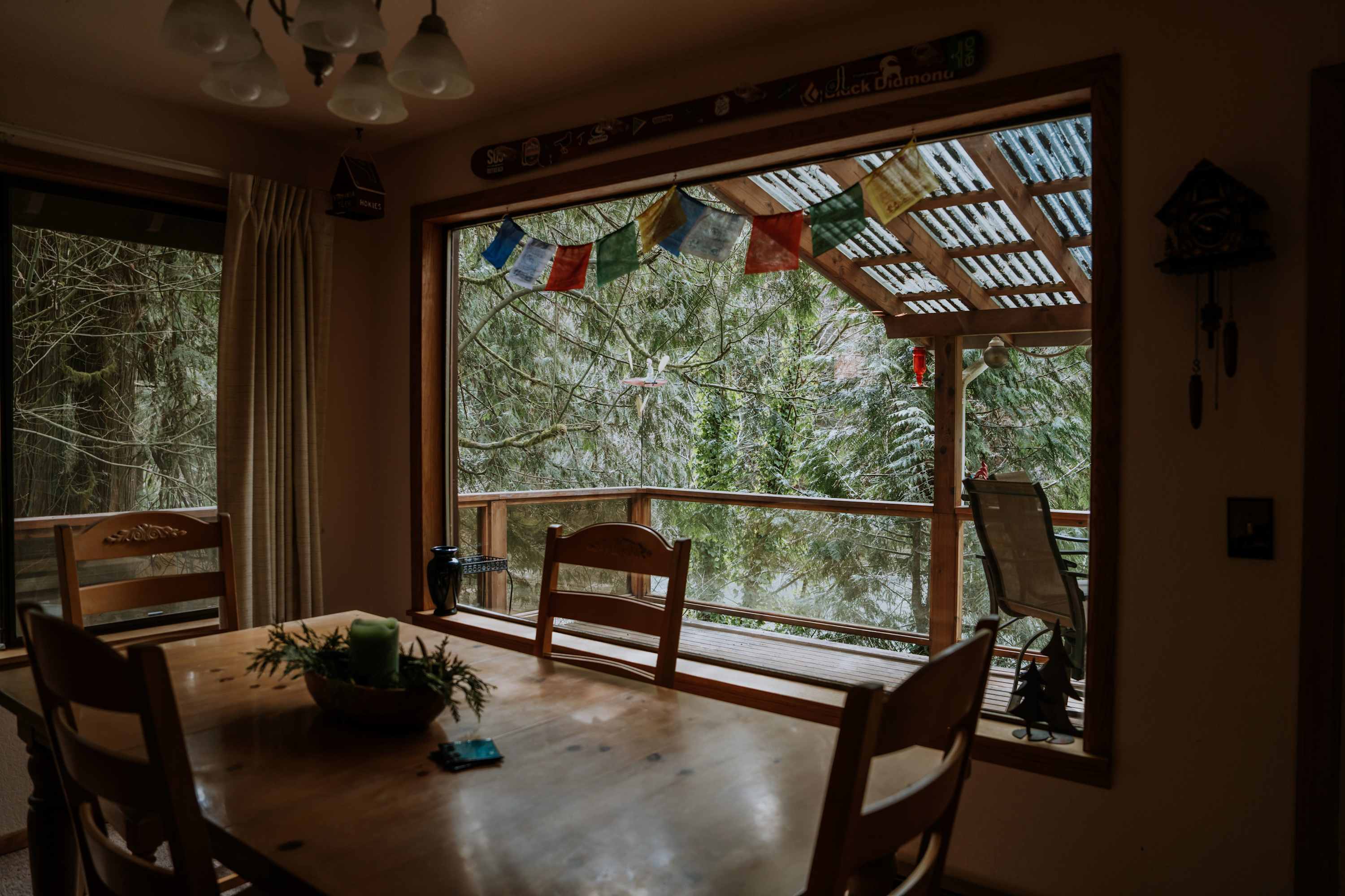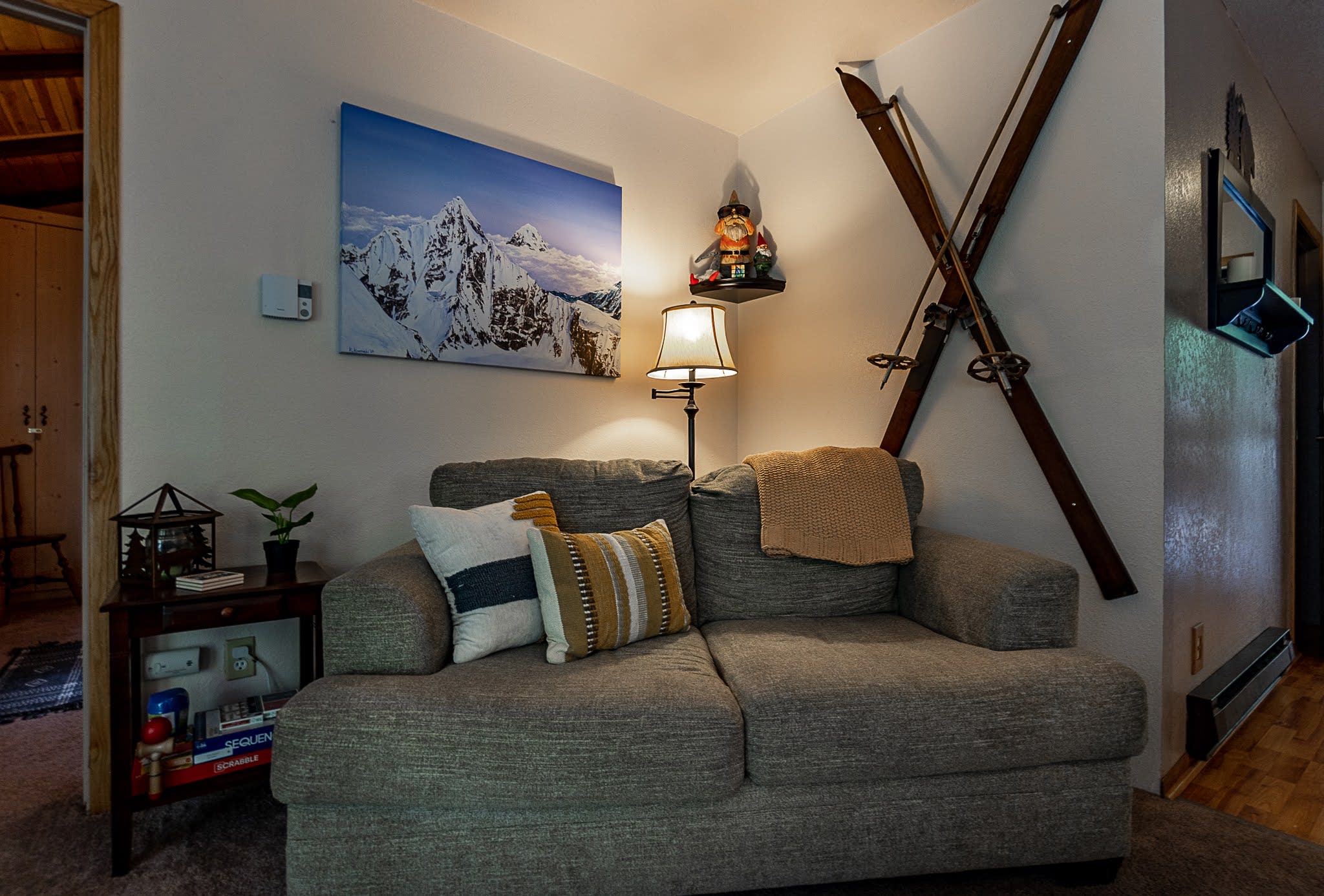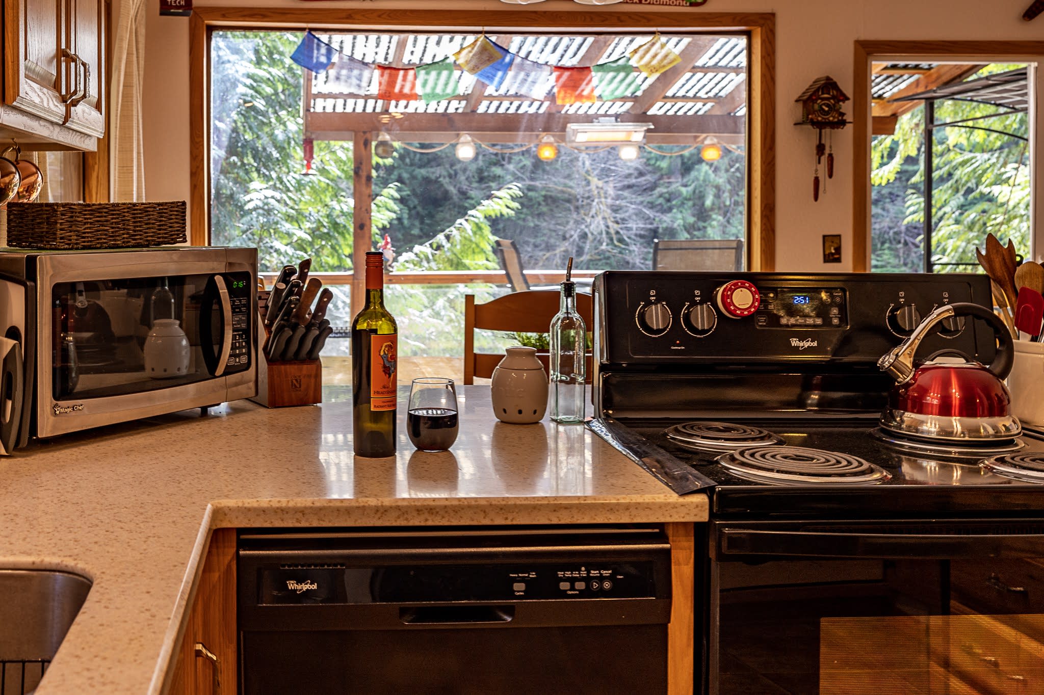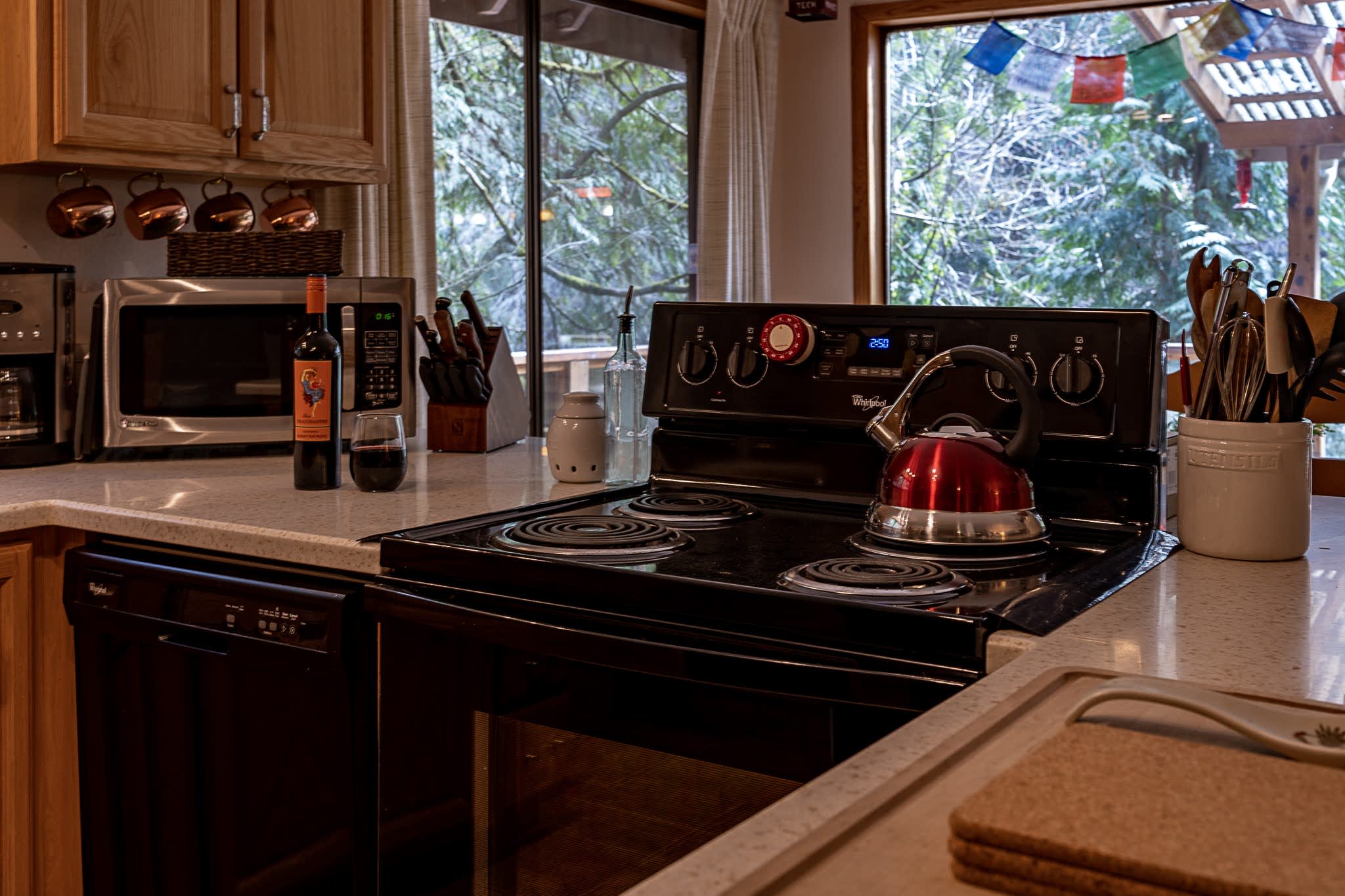 This little cabin is extremely cozy and comfortable. Great view of the river. Neighbors are close by, but it still feels secluded and private. Kitchen is stocked with the basics necessities. Also has a dishwasher. Washer and dryer are located downstairs. Not much of a yard if you have a dog, but the abundance of hiking trails nearby make up for that.