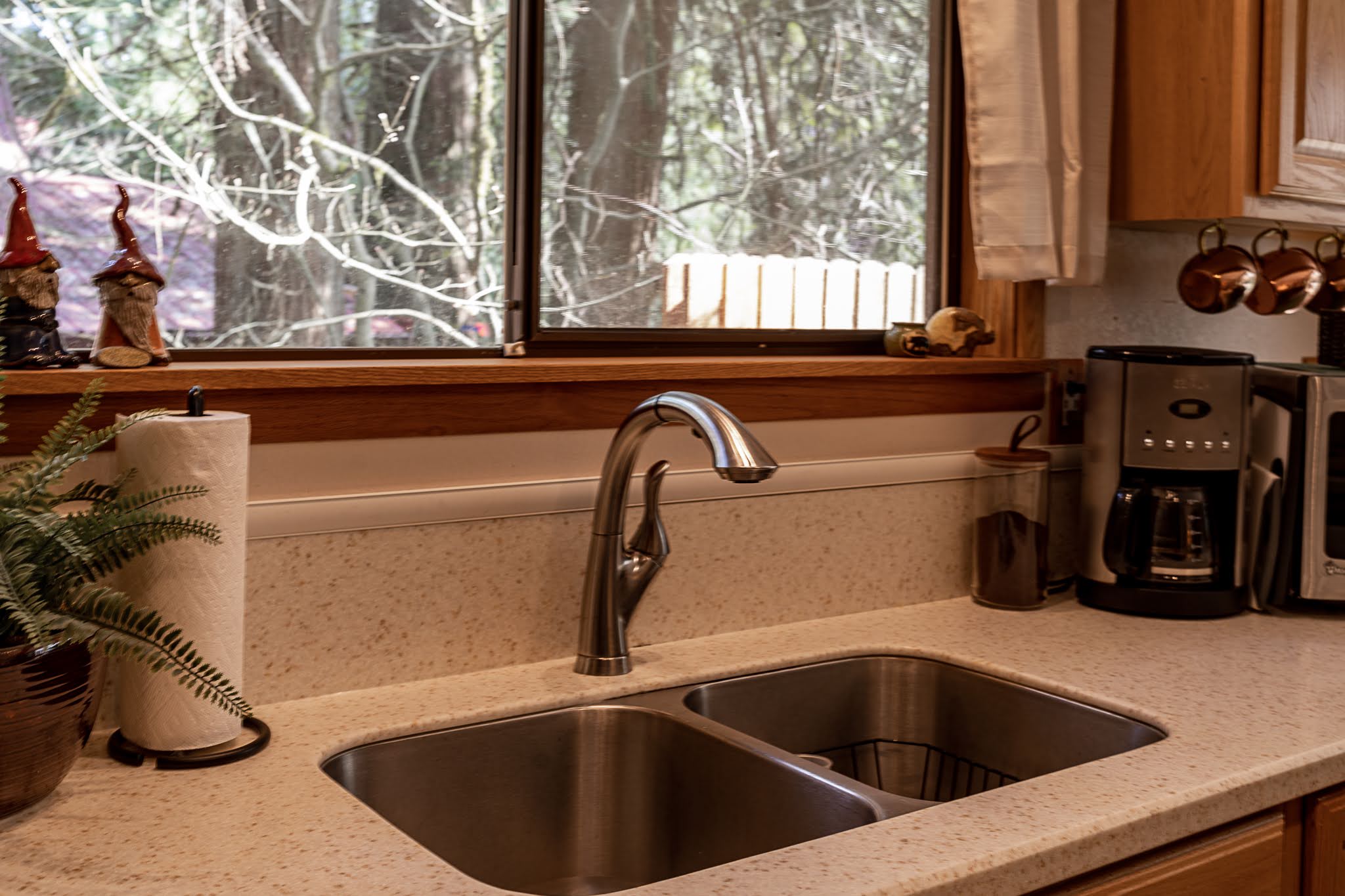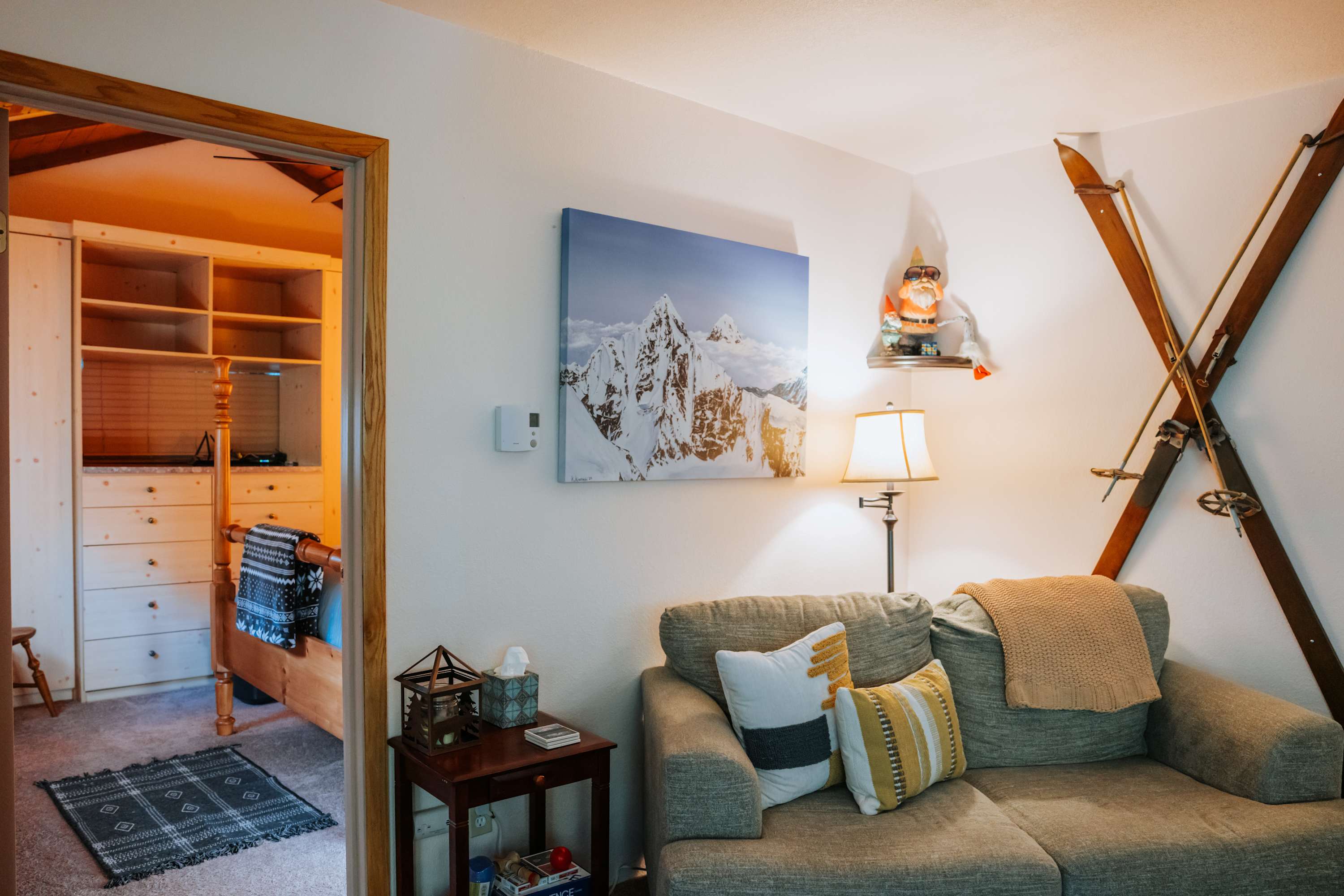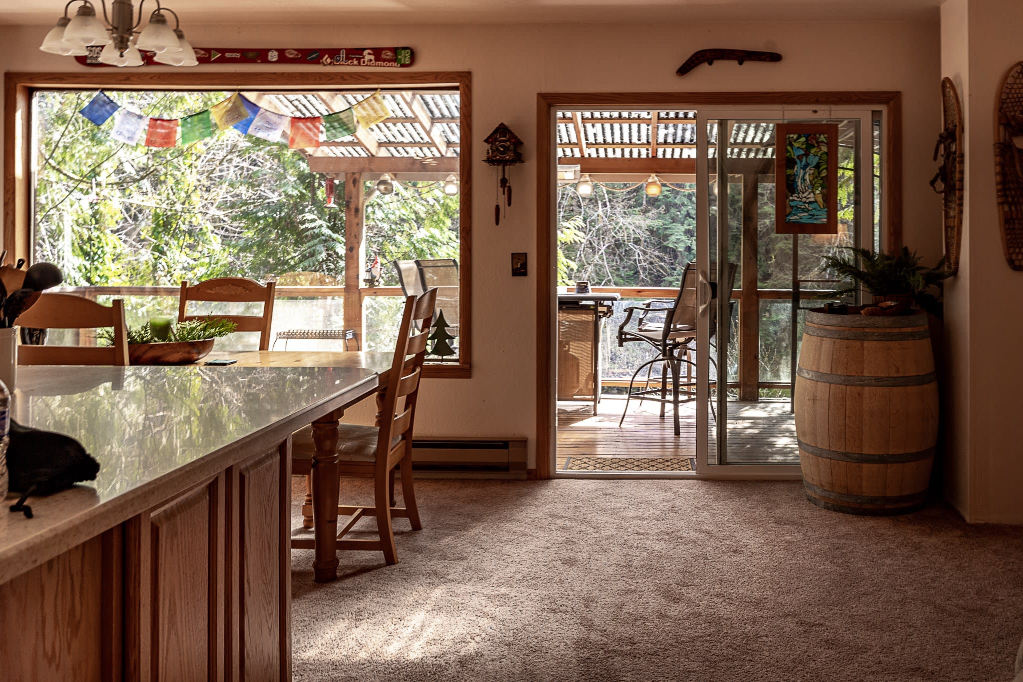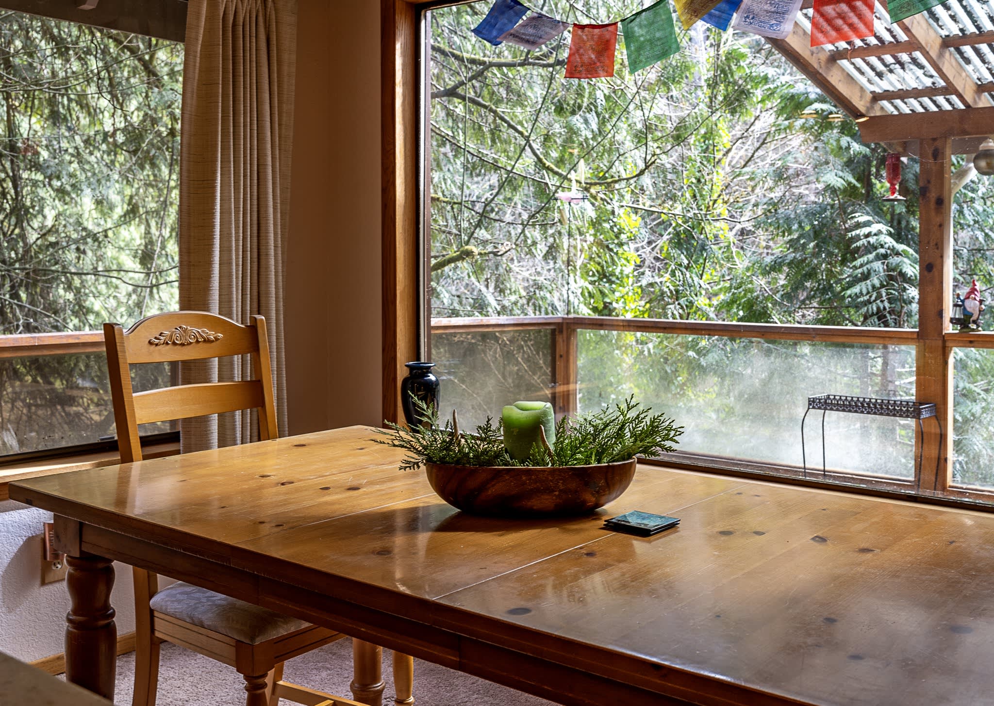 This little cabin is extremely cozy and comfortable. Great view of the river. Neighbors are close by, but it still feels secluded and private. Kitchen is stocked with the basics necessities. Also has a dishwasher. Washer and dryer are located downstairs. Not much of a yard if you have a dog, but the abundance of hiking trails nearby make up for that.