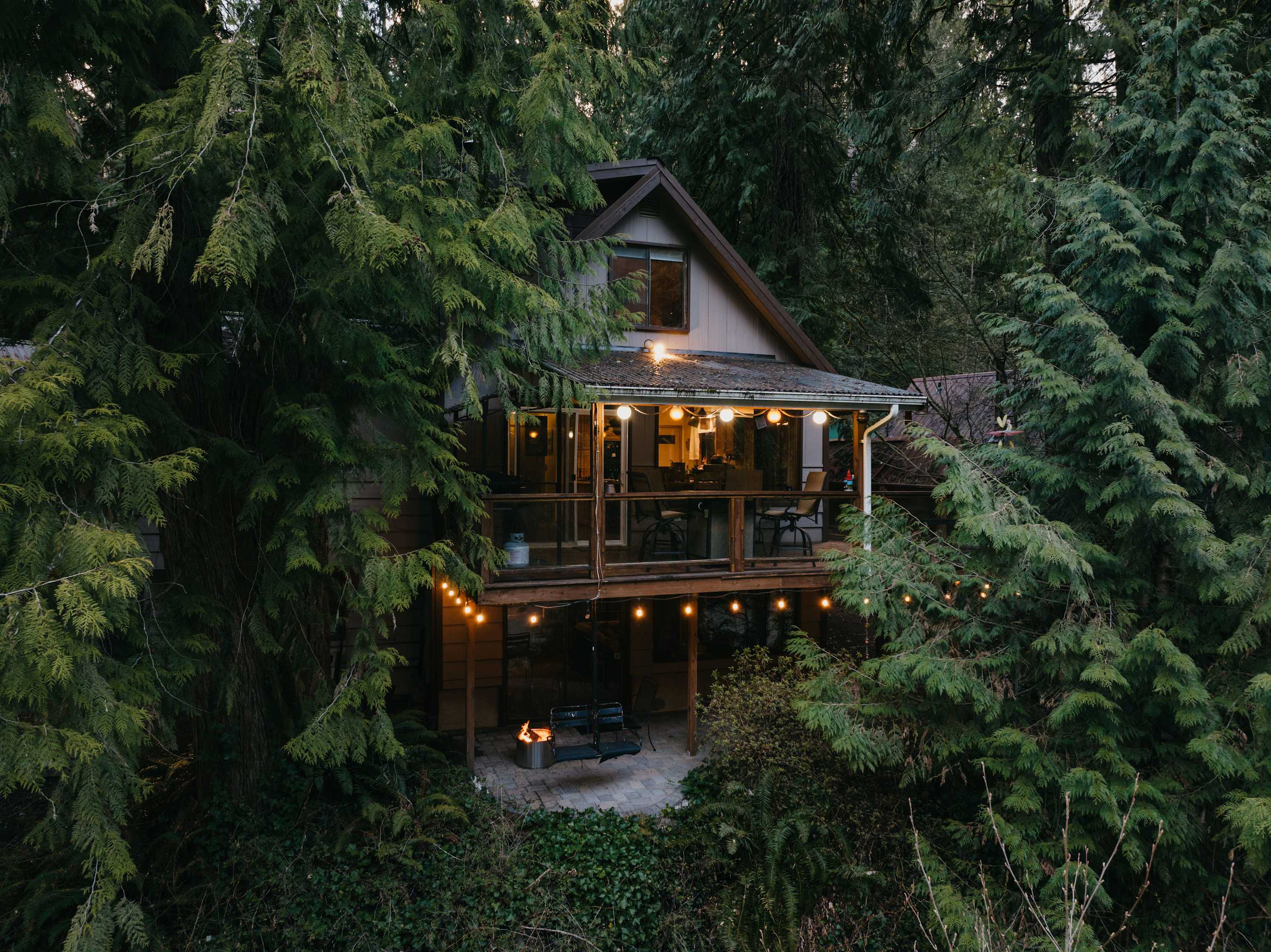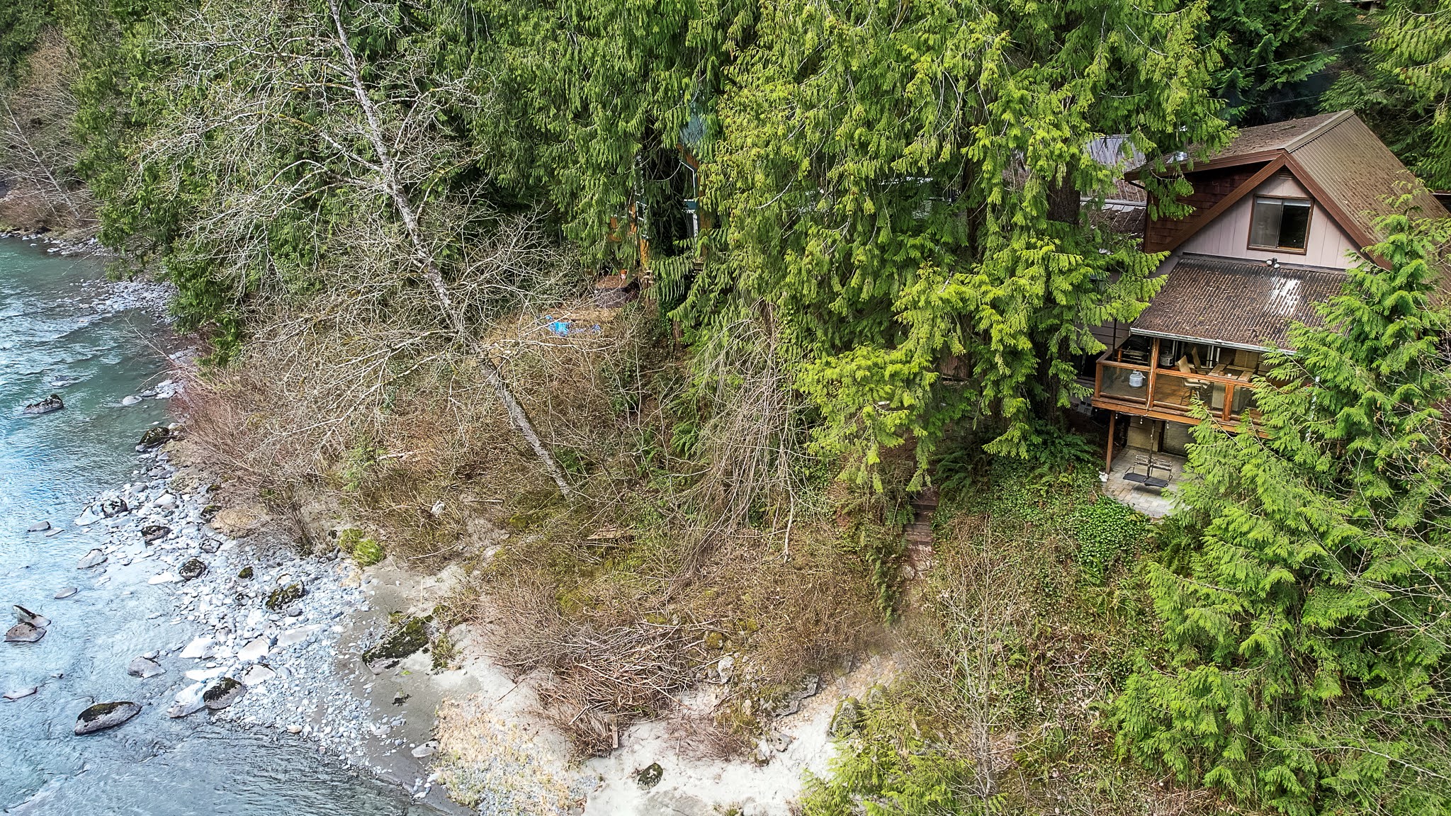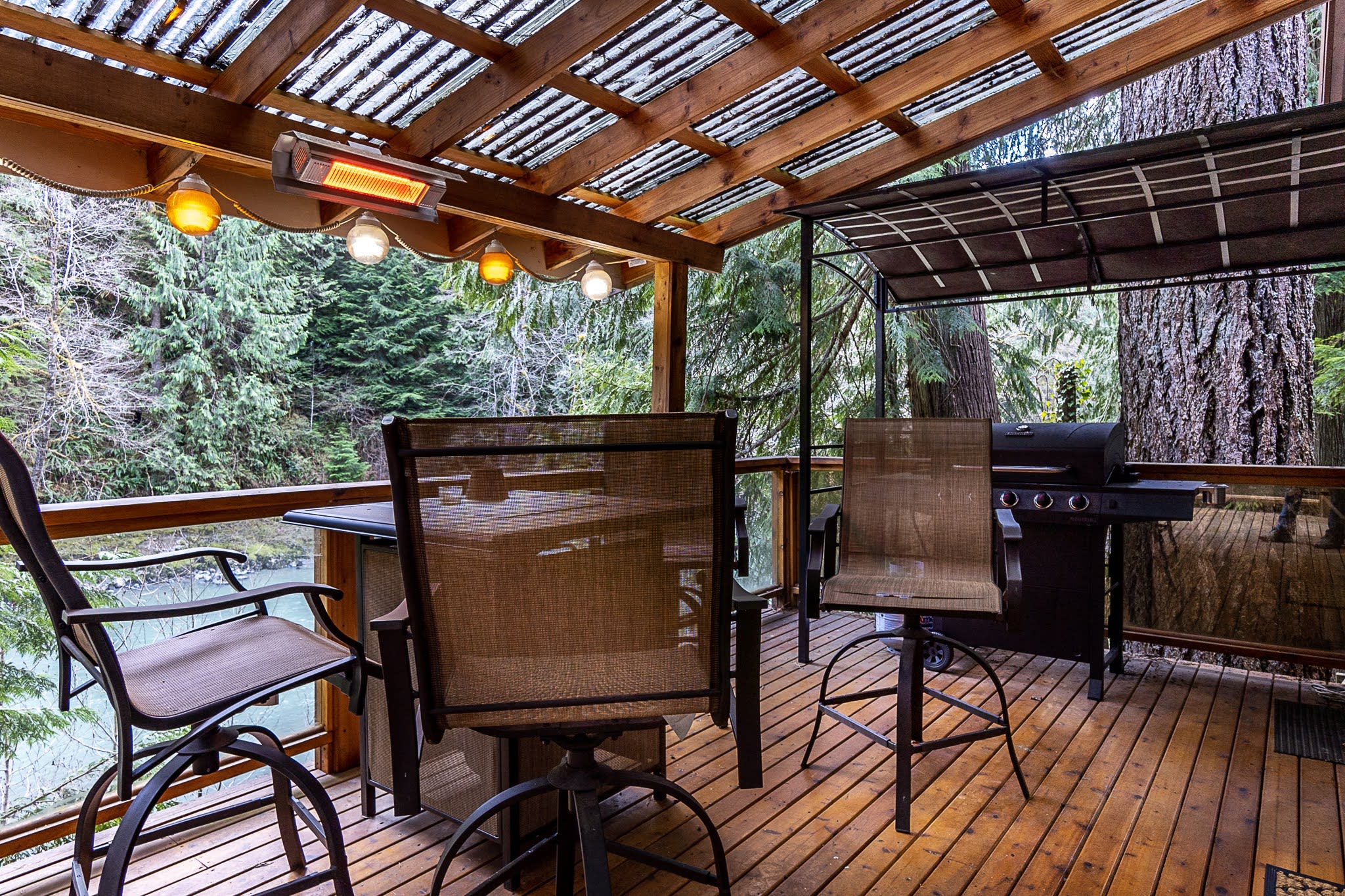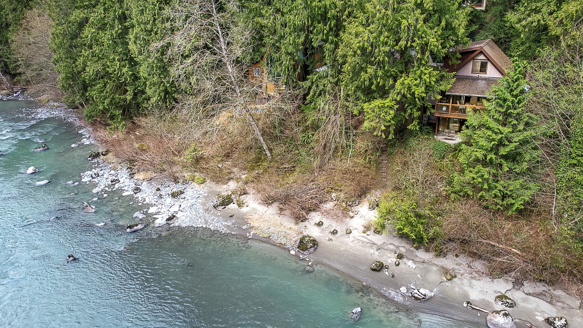 Chase's River Cabin has everything you need for a relaxing getaway. On the main level, you'll find a cozy queen bedroom, a full bath, and a fully stocked kitchen with all the necessary appliances and cookware. The open concept dining, kitchen, and living area is the perfect space to gather with friends and family. Enjoy stunning views of the river from every room on this level, or step outside onto the large gathering deck with heat and BBQ, where you can enjoy a meal or soak in the breathtaking views. Upstairs, you'll find a comfortable queen bed and an ensuite bath in the upper bedroom, as well as a beautiful view of the river from the window. Downstairs, there are two twin beds (bunk beds), a large living area with a fireplace, and a laundry room for your convenience. The lower level also has a great outside patio gathering area, where you can enjoy the views and the fresh mountain air while you soak in our hot tub. And don't forget the cool retro chair lift that you can enjoy swinging on while taking in the beauty of the river! When you're ready to explore, take a short hike from the property or relax by the river on our beautiful beach, complete with a solo firepit for those chilly evenings. Whether you're looking for adventure or serenity, Chase's River Cabin in the PNW has it all. Book now and make your escape to nature!