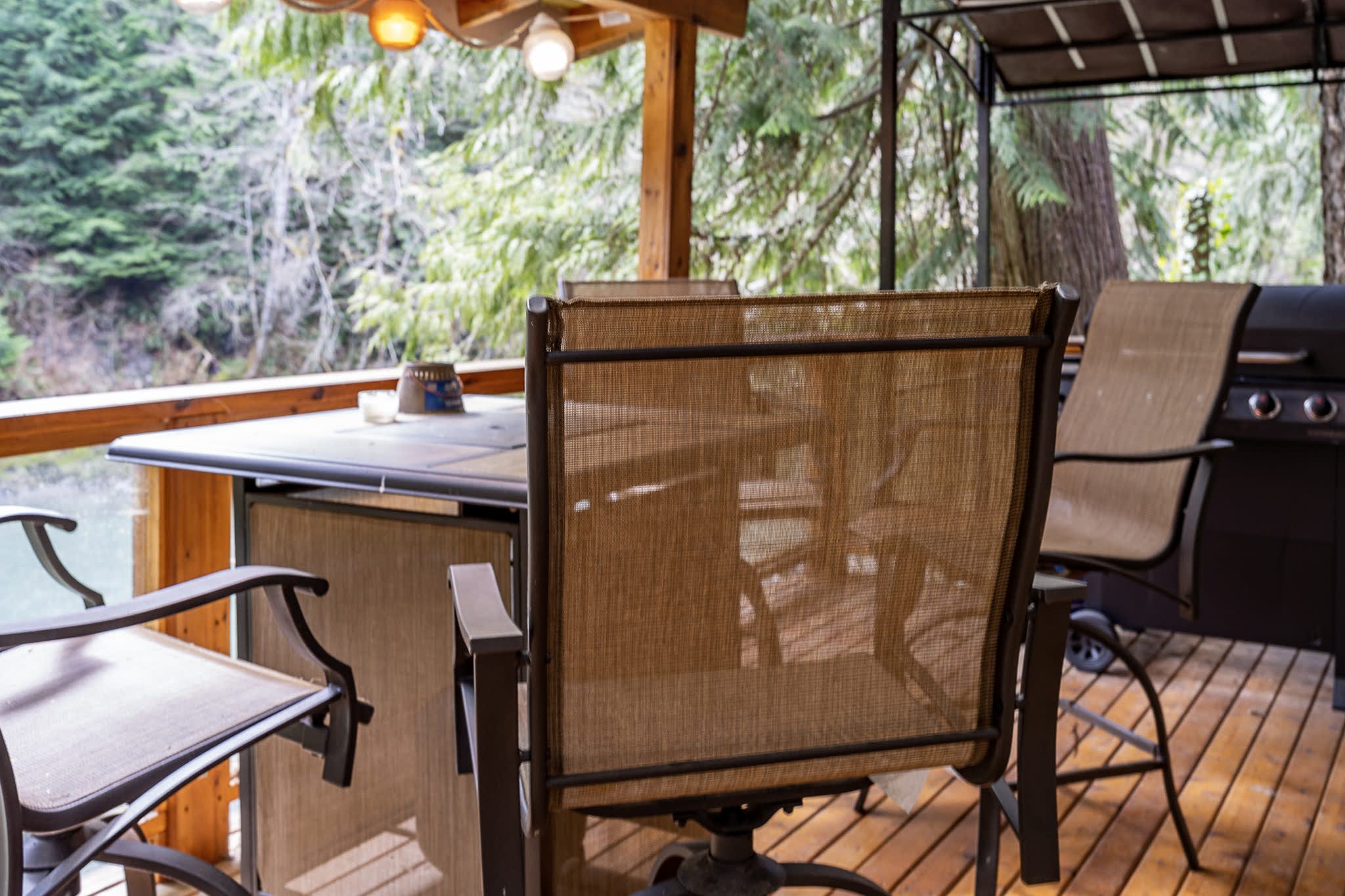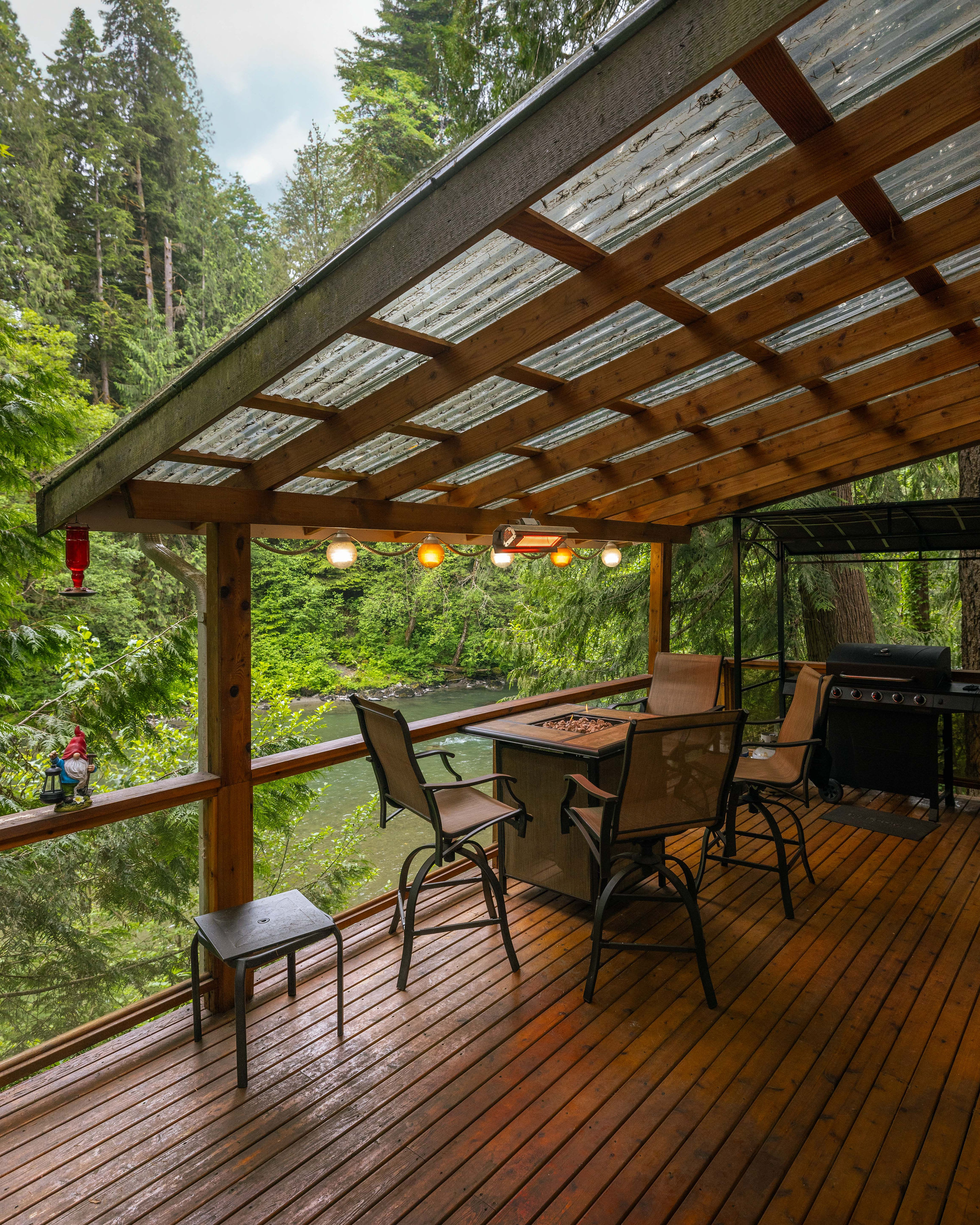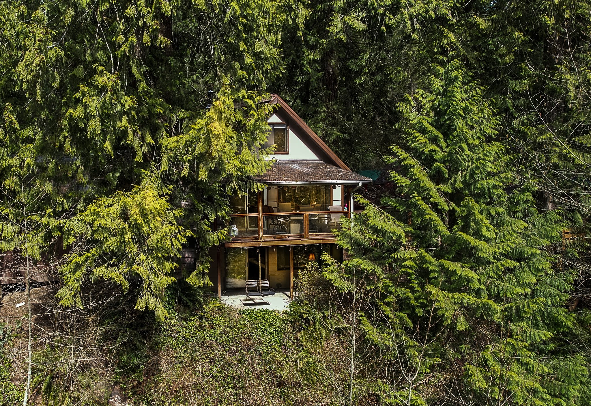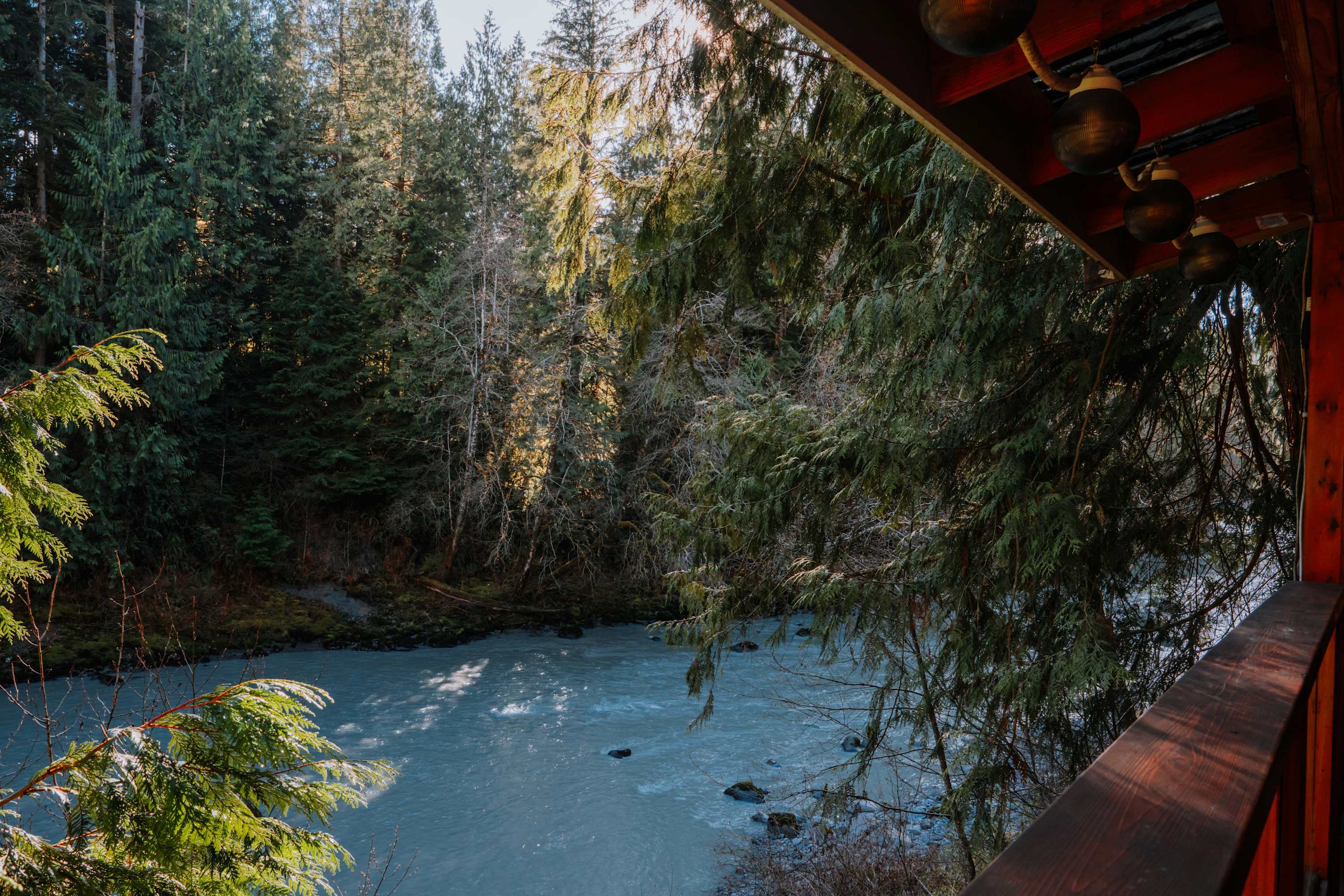 Chase's River Cabin has everything you need for a relaxing getaway. On the main level, you'll find a cozy queen bedroom, a full bath, and a fully stocked kitchen with all the necessary appliances and cookware. The open concept dining, kitchen, and living area is the perfect space to gather with friends and family. Enjoy stunning views of the river from every room on this level, or step outside onto the large gathering deck with heat and BBQ, where you can enjoy a meal or soak in the breathtaking views. Upstairs, you'll find a comfortable queen bed and an ensuite bath in the upper bedroom, as well as a beautiful view of the river from the window. Downstairs, there are two twin beds (bunk beds), a large living area with a fireplace, and a laundry room for your convenience. The lower level also has a great outside patio gathering area, where you can enjoy the views and the fresh mountain air while you soak in our hot tub. And don't forget the cool retro chair lift that you can enjoy swinging on while taking in the beauty of the river! When you're ready to explore, take a short hike from the property or relax by the river on our beautiful beach, complete with a solo firepit for those chilly evenings. Whether you're looking for adventure or serenity, Chase's River Cabin in the PNW has it all. Book now and make your escape to nature!