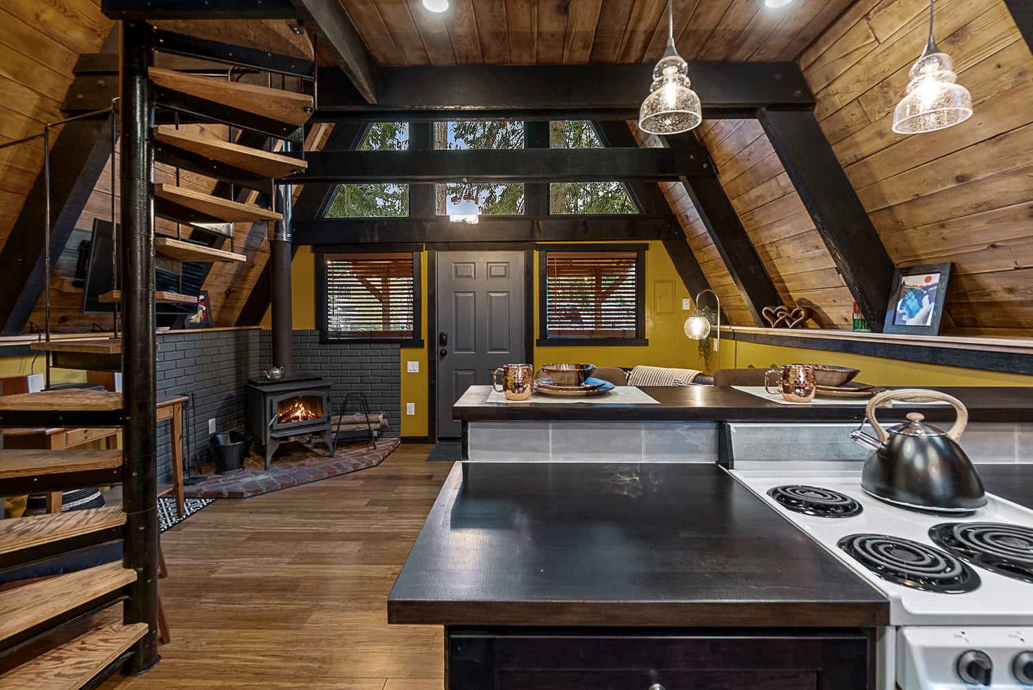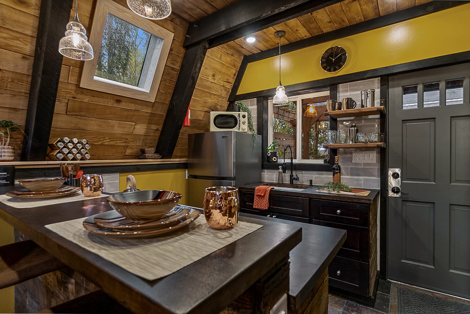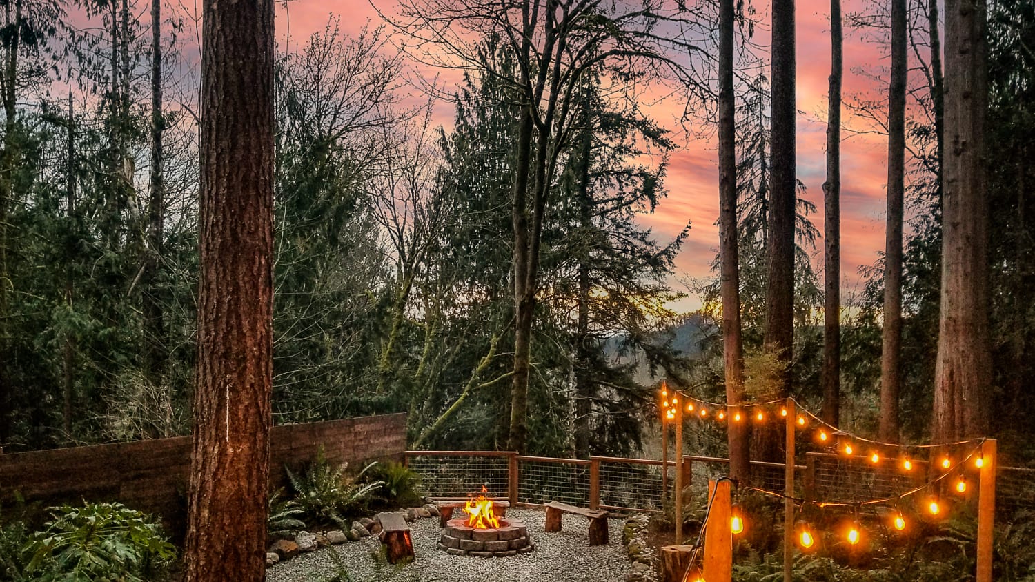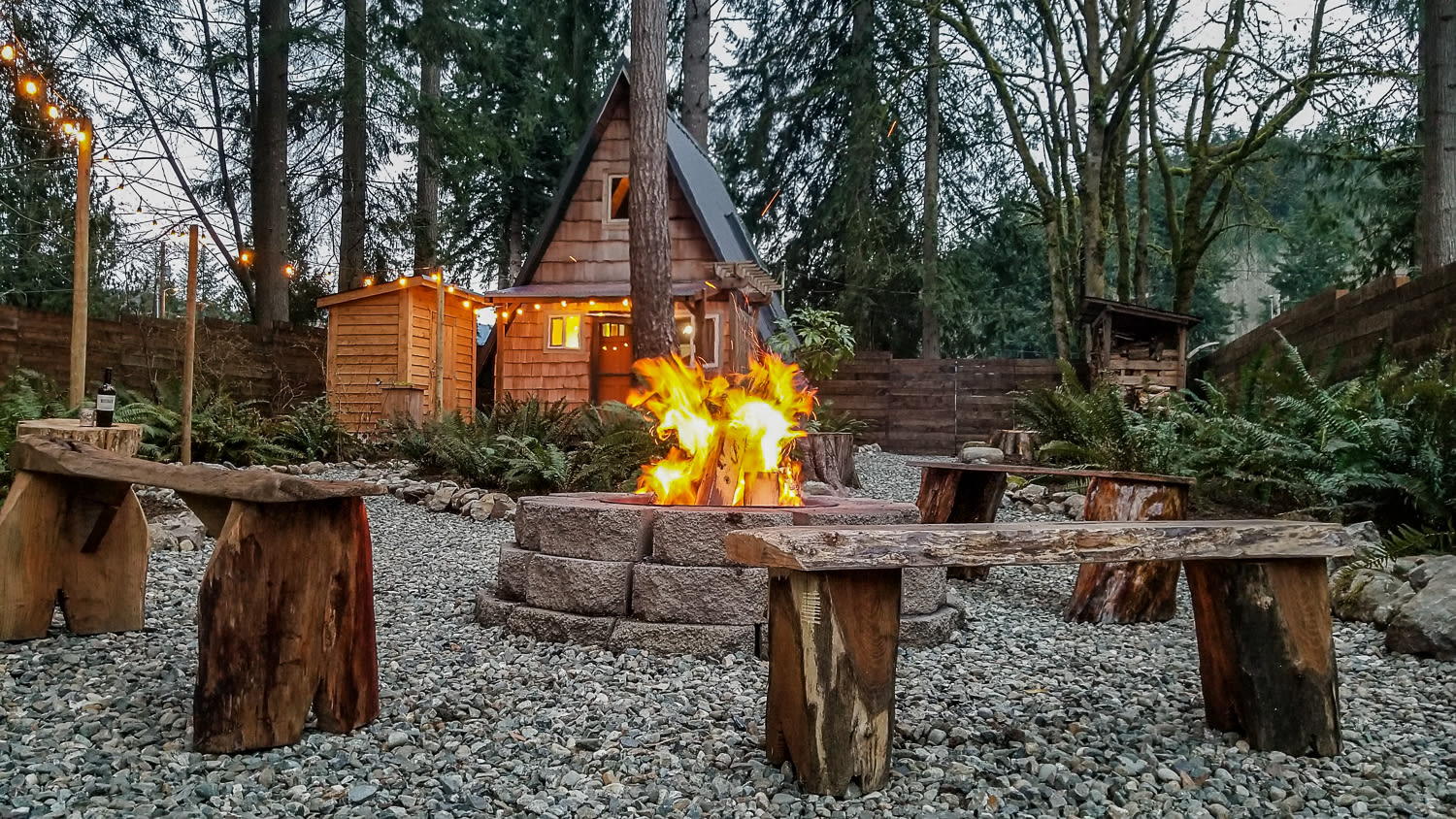 This cabin is an excellent base camp for hiking trails near Granite Falls with a comfortable hot tub, organized kitchen, and inviting fire pit.