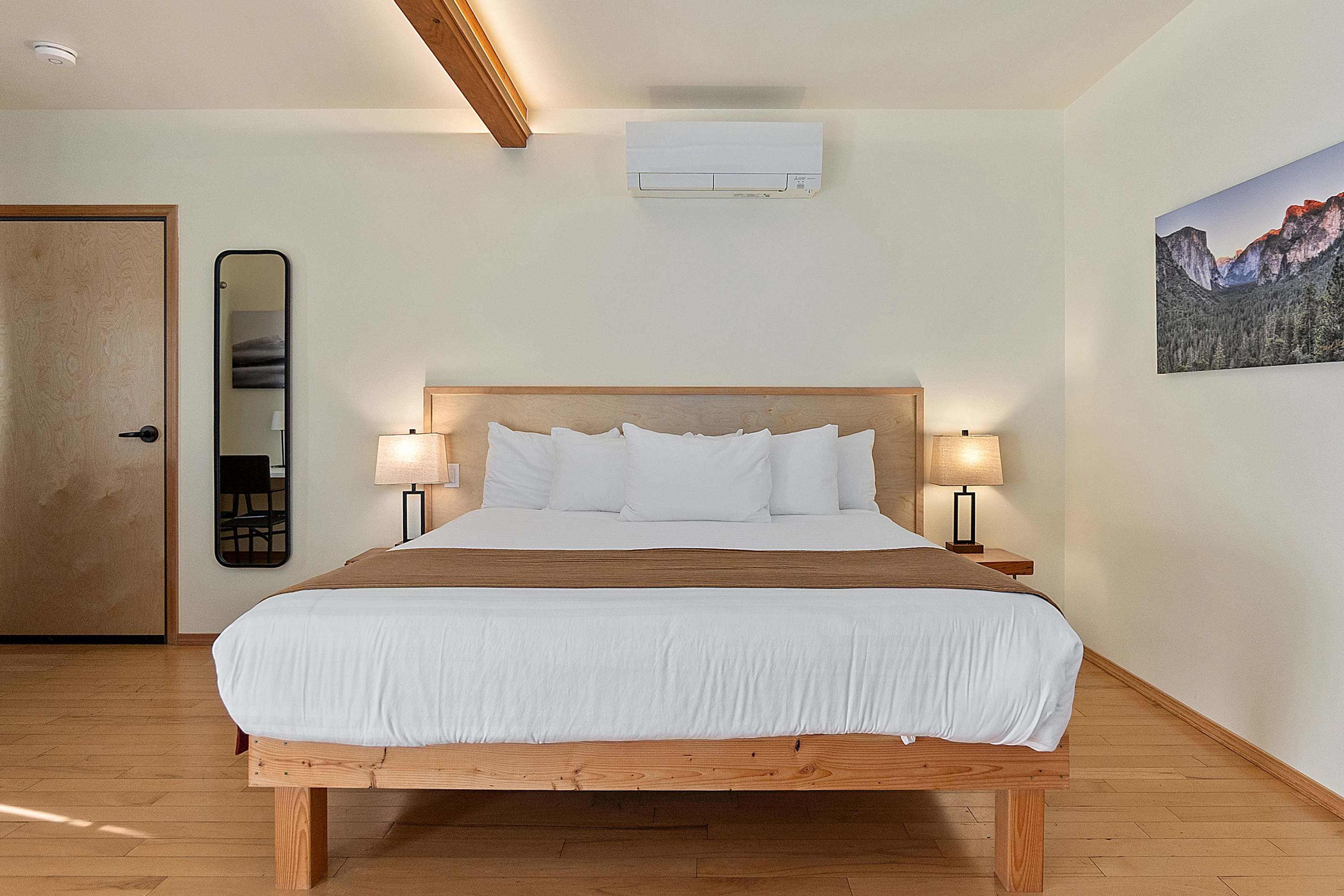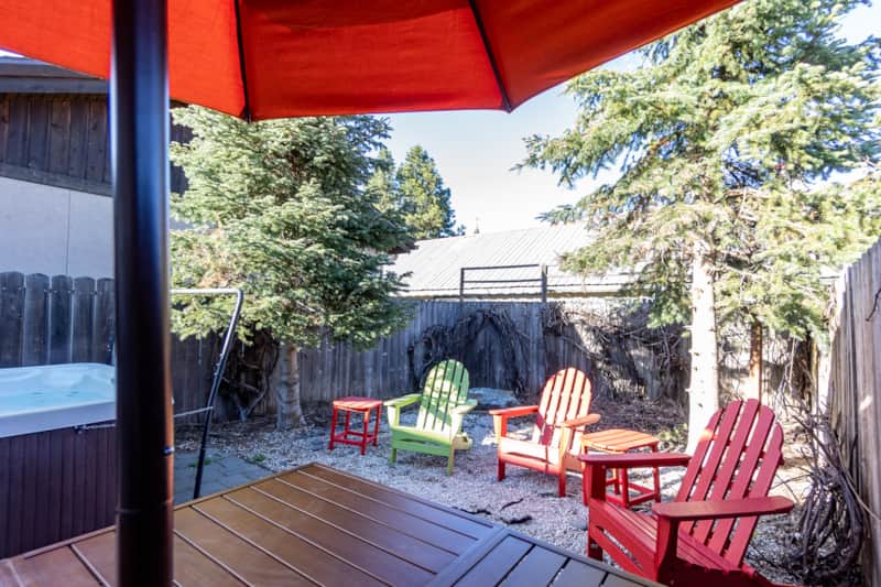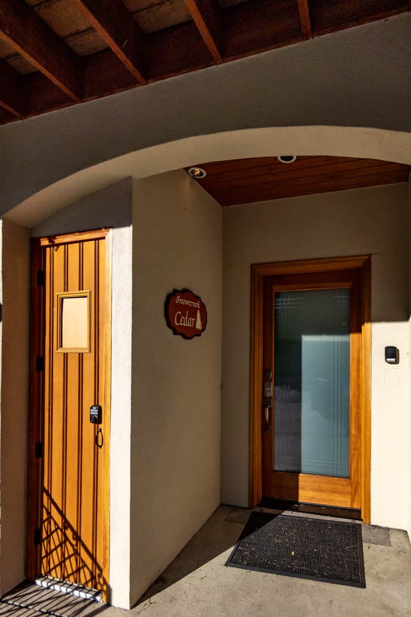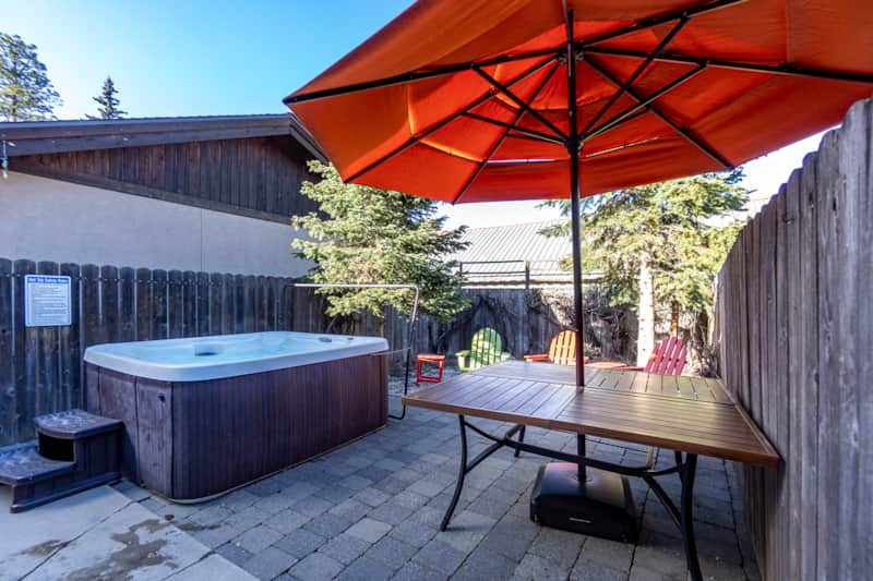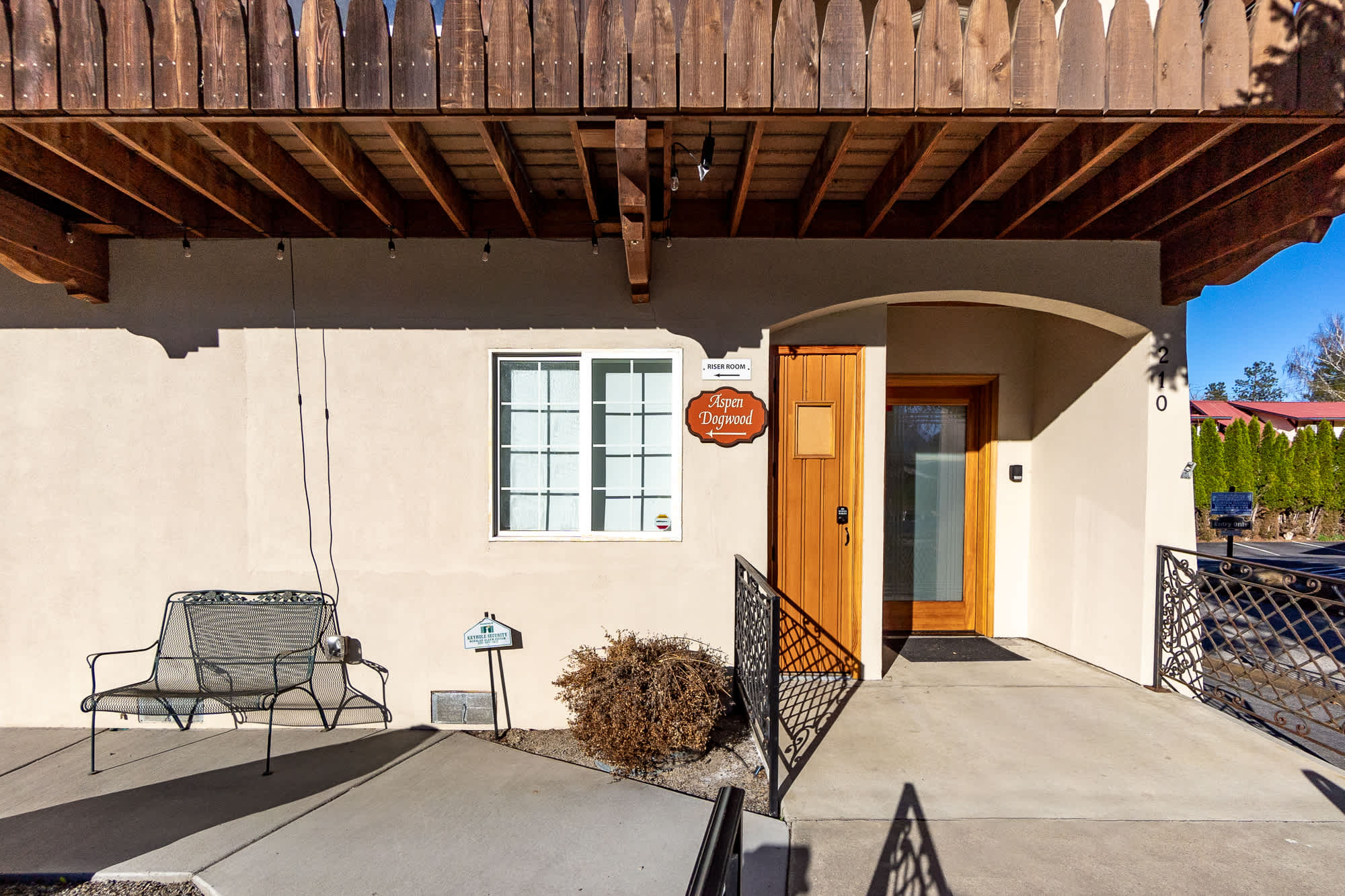 The Cedar Suite has a King sized bed. The bathroom is ADA-approved. There is a community back patio area with barbeque, patio furniture, and hot tub for all of the Snowcreek units.