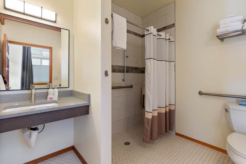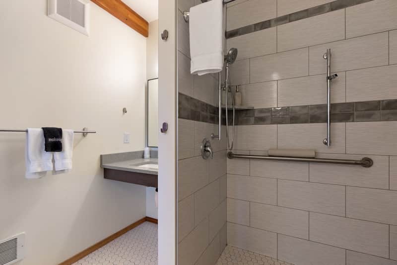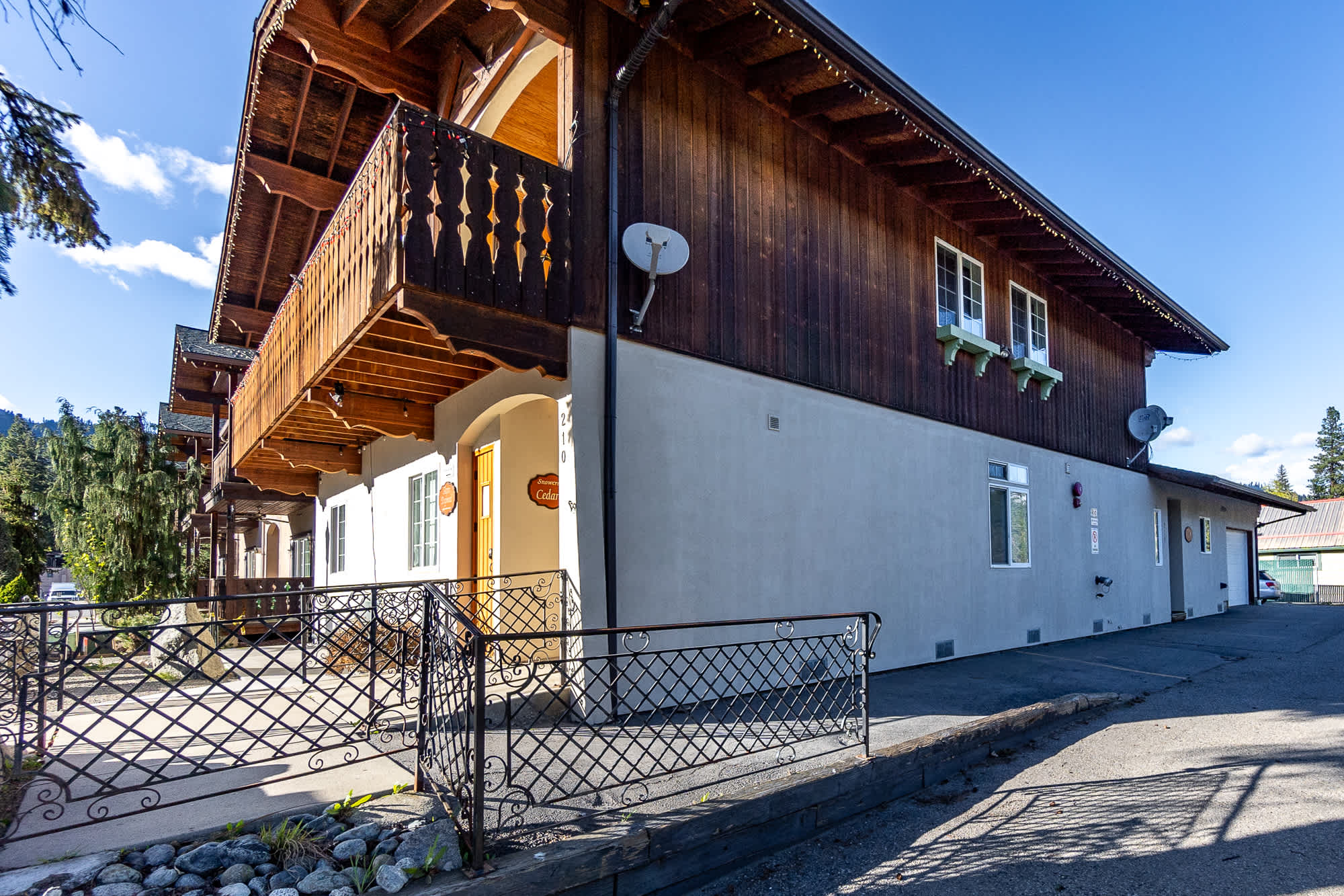 In the heart of Leavenworth lies Snowcreek Cedar, a renovated, ADA-approved ground floor Condo. It features a spacious king bed. The private wet bathroom includes grab bars and a shower seat for accessibility. Basic kitchen amenities like a coffee maker, microwave, and mini-refrigerator are provided for your comfort. Cedar Suite connects to Dogwood, accommodating up to 7 guests for a memorable stay. You are right in the heart of Leavenworth village!